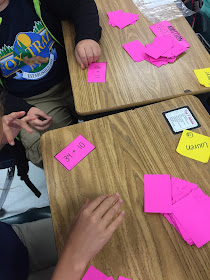 Below, the students are playing "Addition Fast Draw". They each flip one of their cards and quickly solve the math equation. Whoever wins by saying their fact the fasted (and accurately!) gets to keep both cards. At the end of their decks, the player with the most cards wins the game. The other "Fast Draw" games have the same rules, but for different operations. This makes it easy for students to go and grab the game they need the most practice in, without having to learn so many different game rules.